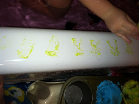 Then, which encouragement, I showed him that he could paint on his skin...not just the bathtub walls.